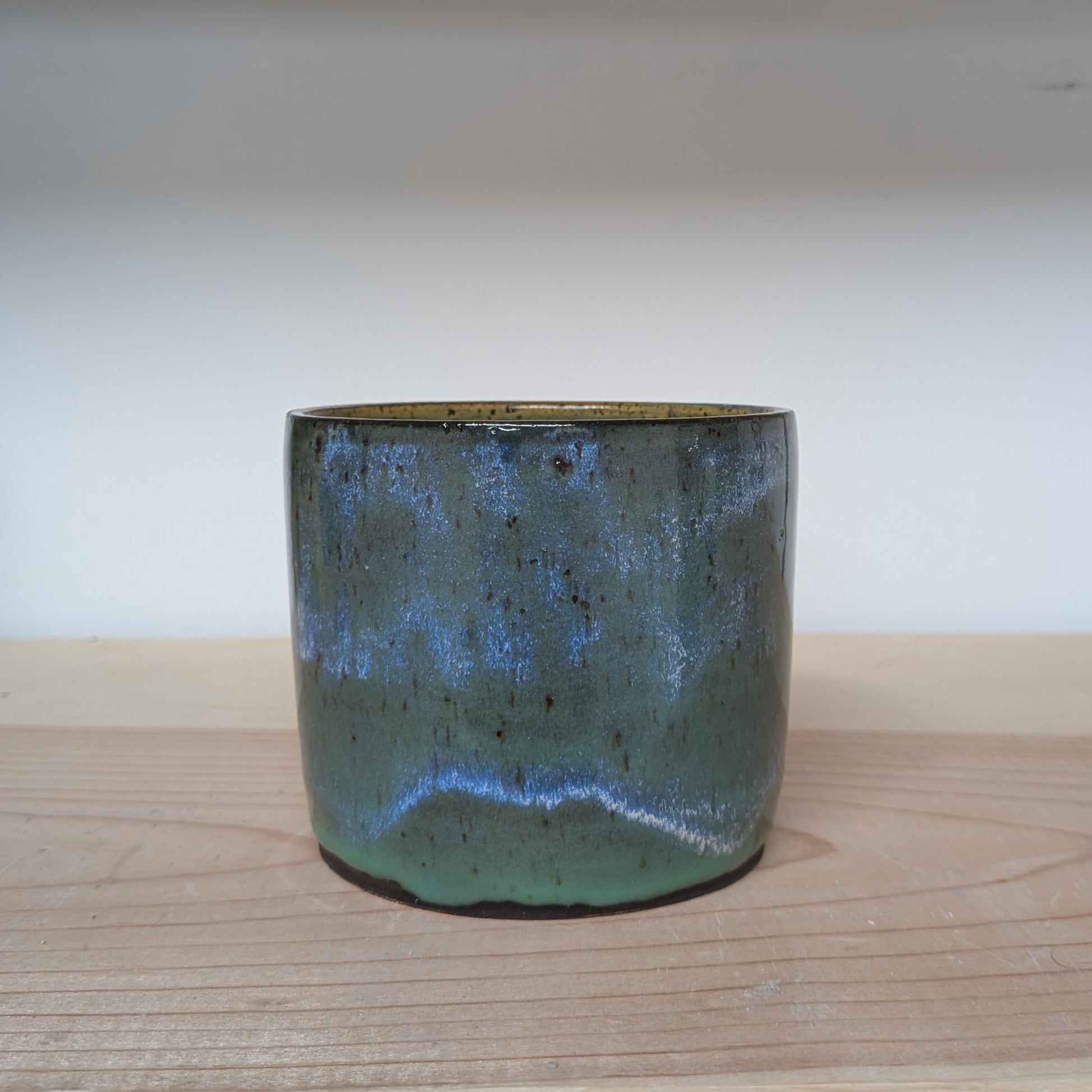The star of this mug is the glaze. The layers are picked to melt the together creating aurora borealis-like waves of color. It is shaped on the wheel, then hand glazed and kiln-fired for a durable finish.