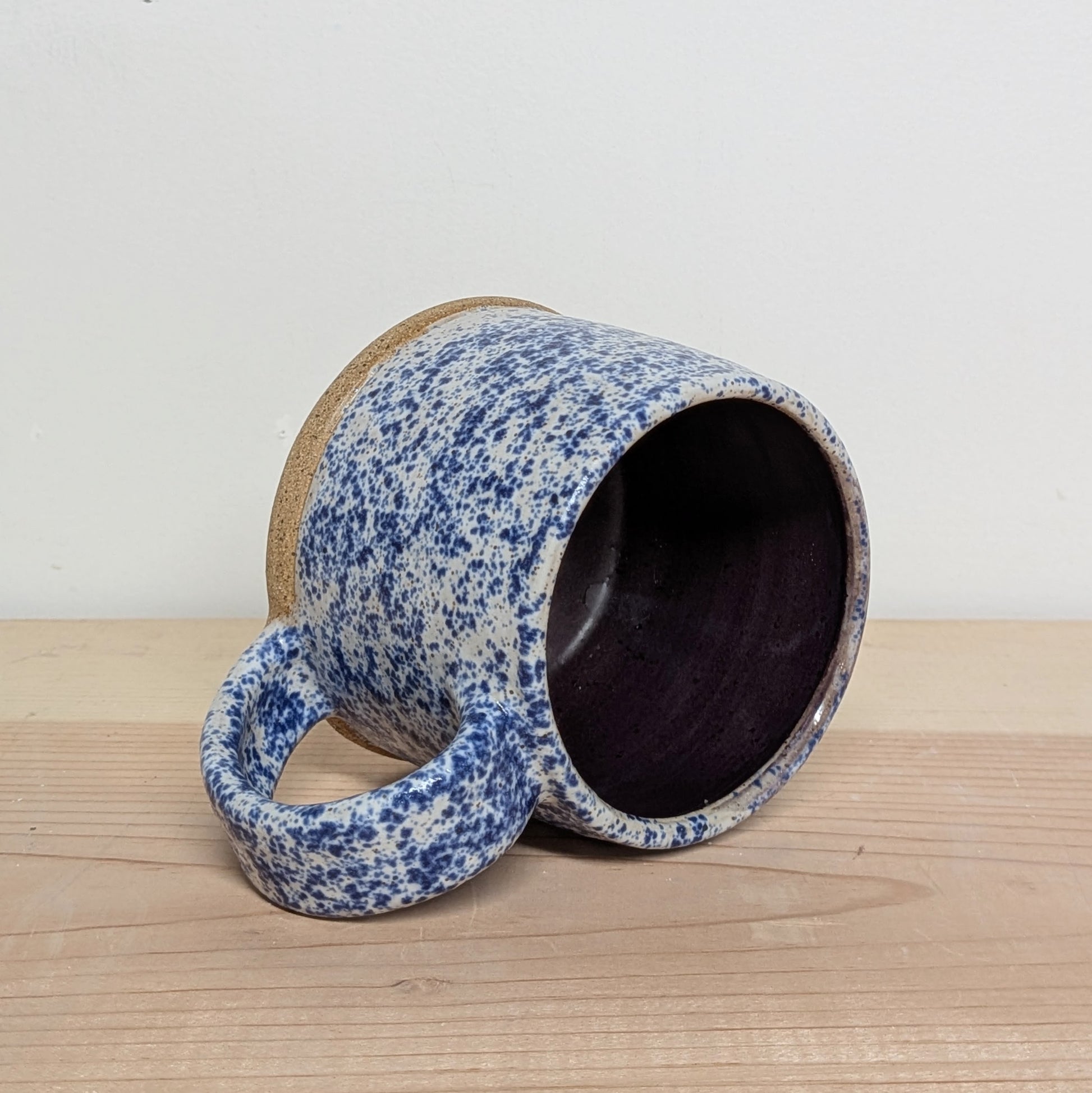 A medium size mug, good for a sizeable cup of coffee but also a perfect size for a tea. Thrown on the wheel then a hand-pulled handle is attached. This mug has a special glaze that contains specks of blue that melt during the firing. To achieve this surface, the speckley glaze is painted on, then a top layer of a beautiful opalescent white is added to the top, to melt the blue into the surface of the mug.