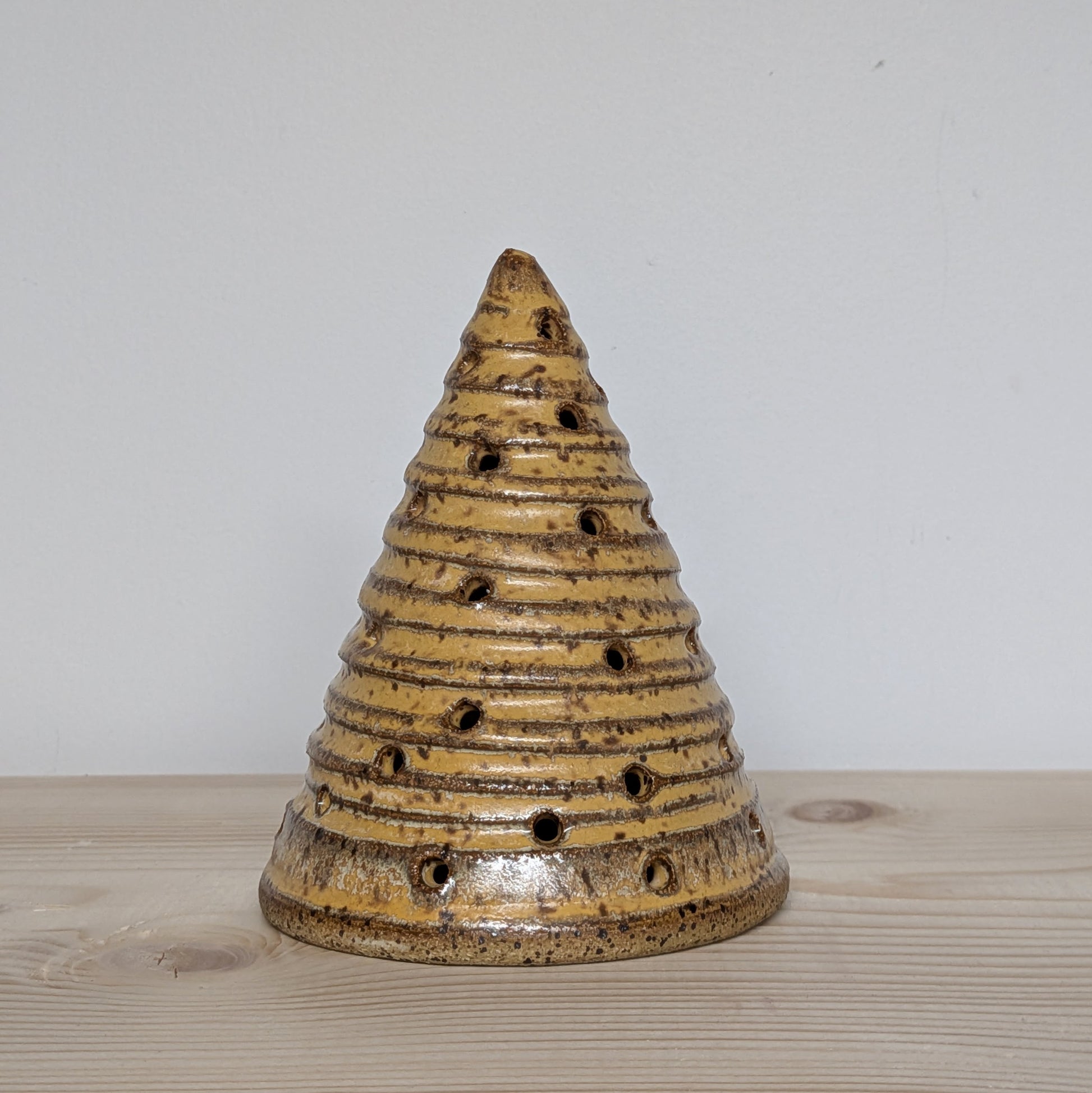 Thrown on the wheel, trimmed, pierced and glazed before being fired in kiln. Place over LED candle for votive use.