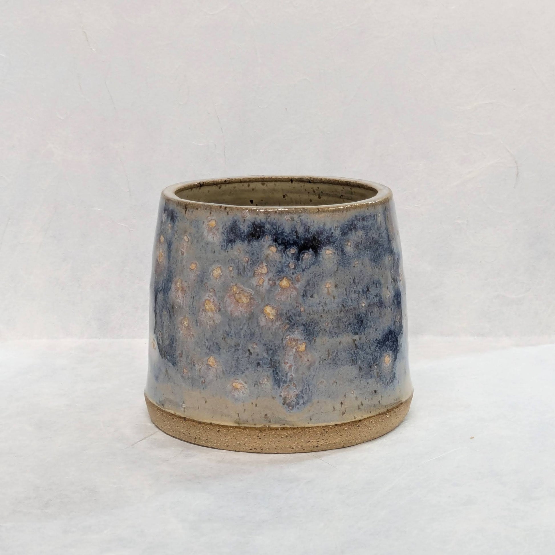 The star of this mug is the glaze. The layers are picked to melt the crystals into a beautiful and starry surface. The inside is a birch color. A rounded rim that is just right to drink from, a wide base with subtle bevel on the bottom. It is shaped on the wheel, then hand glazed and kiln-fired for a durable finish.