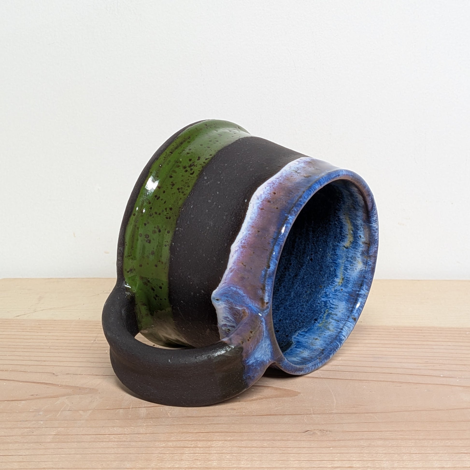 A coffee mug inspired by the Wicked movies, glazed with a beautiful variegated purple at the top and a vibrant green on the bottom. Purple and green are layered on top of a sparkly black engobe finish. A medium size mug, good for a sizeable cup of coffee but also a perfect size for a tea. Thrown on the wheel then a hand-pulled handle is attached.